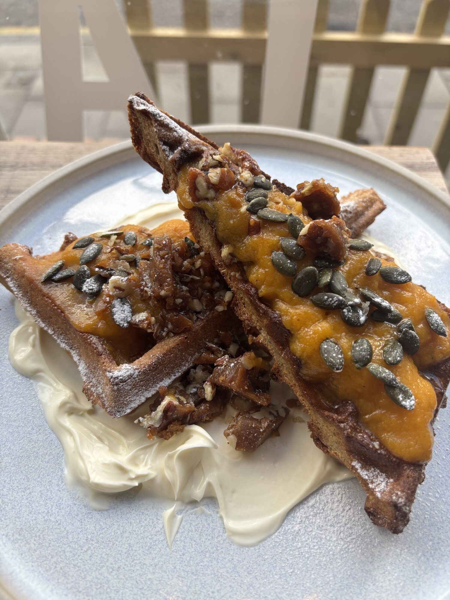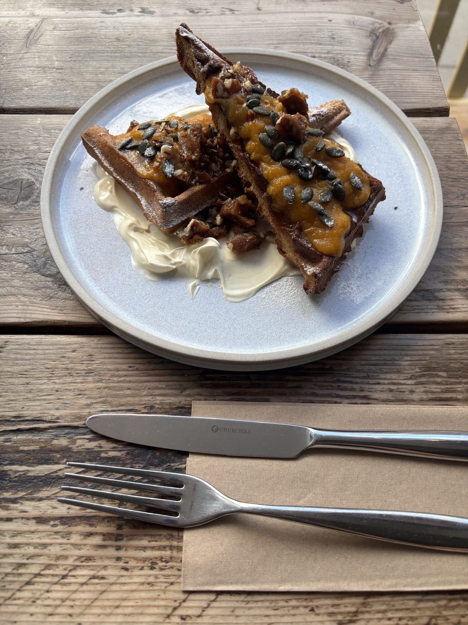 These aren’t your average waffles. Infused with warming cinnamon, they arrive at the table golden and fragrant, a soft cloud of spice and sweetness in every bite. But the magic really happens in the details: the homemade nut brittle brings a delicate crunch and a caramelised depth that balances the softness of the waffles, while the smooth butternut squash purée adds a vibrant, earthy sweetness. It’s autumn on a plate — indulgent yet grounding, hearty yet elegant.